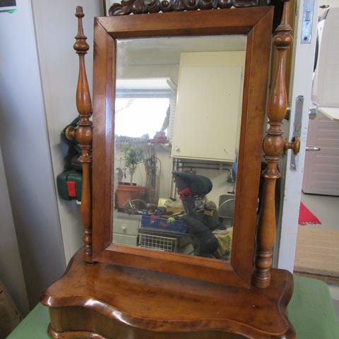 Pigtittare äldre modell, fint skick men övre delen på lådan har av spegelns tyngd lossnat en aning. Inget som märks vid användandet. Har inte velat limma. Mått: som högst 67 cm, djup 20 cm och som bredast 52,5 cm.