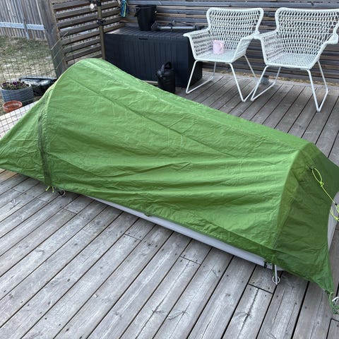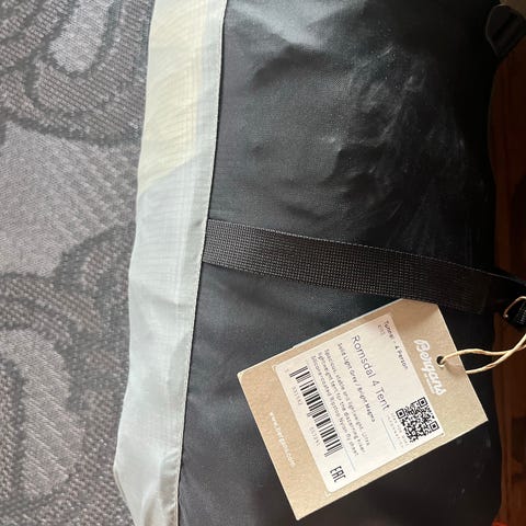 Bra skick. Inga synbara fel på tältduken. En del tältpinnar är utbytta mot Urberg Y-Peg som sitter stabilare i marken än originalpinnarna.