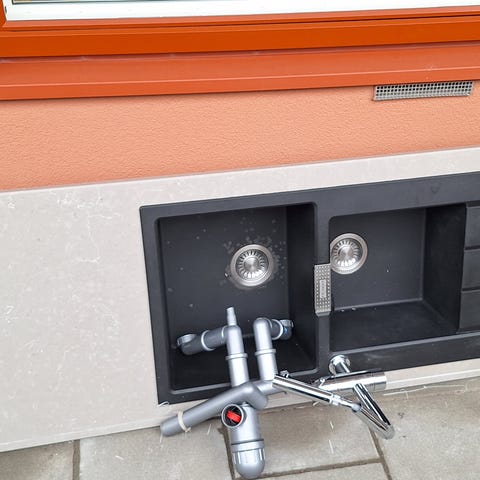 Begynnande sprickor i bänkskivan med diskho, en sida av stomme trasig.
