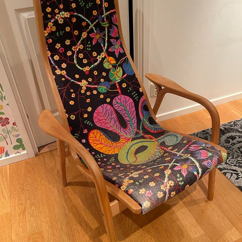 Bruno Mathsson Pernilla, inköpt 1966, originalsadelgjord. Finns i Vasastan, Stockholm.