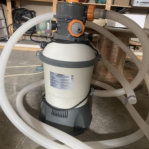 Poolpump med filter och flera slangar, se bild för detaljer. Smidig att koppla in till poolen med de medföljande anslutningarna.
