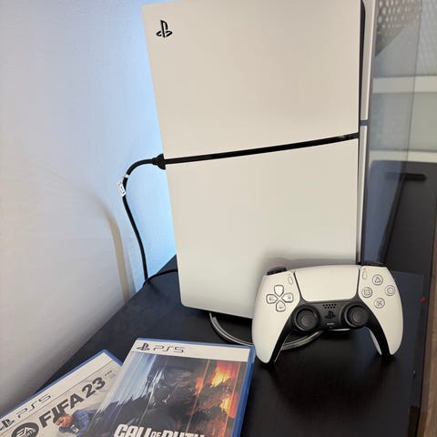 PlayStation 5 Disc säljes i mycket fint skick. Konsolen fungerar bra och kommer med två handkontroller, kablar och spel.