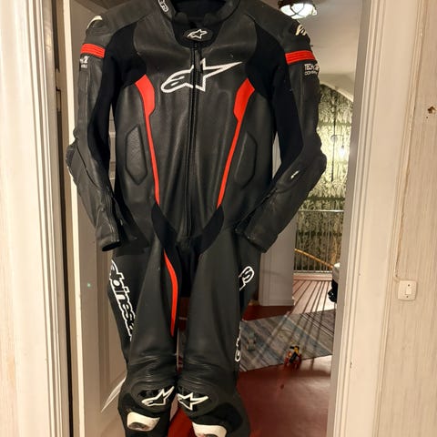 Alpinestars Missile V3 mc-läderbyxa i stl 50, lång. Svart med stretchpaneler och knäsliders. Har dragkedja i benslut, justerbar midja och kan kopplas ihop med jacka via dragkedja i midjan.
