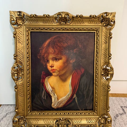 Tavlan sitter i en gedigen och elegant ram (guld/trä) som ger ett lyxigt intryck på väggen.