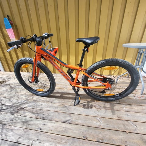 Scott Scale barncykel med 24" hjul i gul färg. Utrustad med Shimano-växlar, fjädrad framgaffel och handbromsar fram och bak.