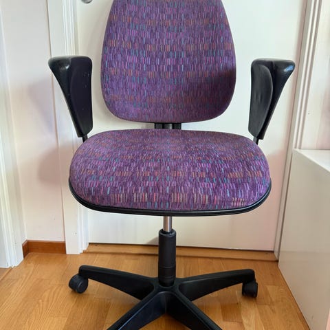 Mycket bekväm kontorsstol i Manchesterklädsel. Färgerna är lejongult, orange och gammalrosa. Mycket snygg. Kinnarp.