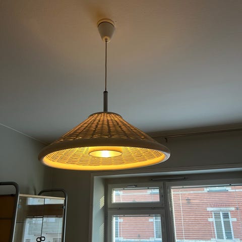 Snygg taklampa med svart skärm i ribbad plast som ger ett fint ljus. Hängs i sladd från taket och passar bra över bord eller i vardagsrum.