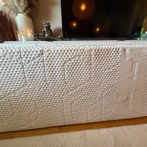 Bäddmadrass Jysk GOLD T65 i storlek 80x200 cm med vit, mönstrad överdel. Avtagbart överdrag med dragkedja runt kanten som gör den enkel att ta av och på. Nypris ca 800 SEK
