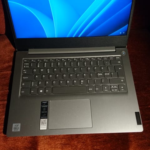 Lenovo laptop med 16-tums skärm och 8GB RAM i blå färg. Tunn modell med fullstort tangentbord och stor styrplatta.