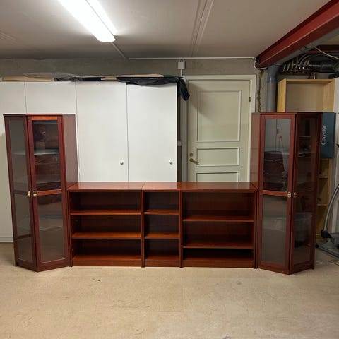 Bokhylla i mahognyfärgad faner i 5 delar varav två stycken vitrinskåp och tre stycken bokhyllor. Ena gaveln har stått mot fönster och blekts lite av solljus, samt en skada i sockeln på en sektion. (Se bilder).