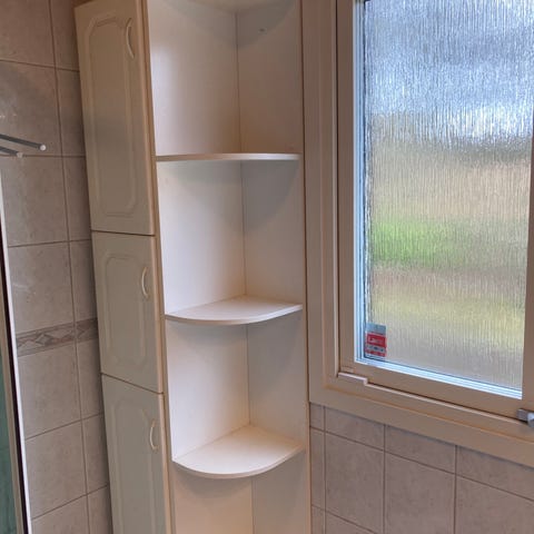 Vitt badrumsskåp med dörr och flera hyllor för förvaring av flaskor och småsaker. Passar bra i hörn av badrummet och är lätt att komma åt från duschen.