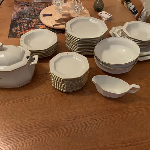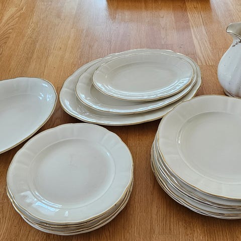 Porslinservis från Victoria China Tjekoslovakien ,med vita tallrikar och fat med guldfärgade kanter. Flera olika storlekar på tallrikar och serveringsfat ingår i samma serie. Matservisen är från