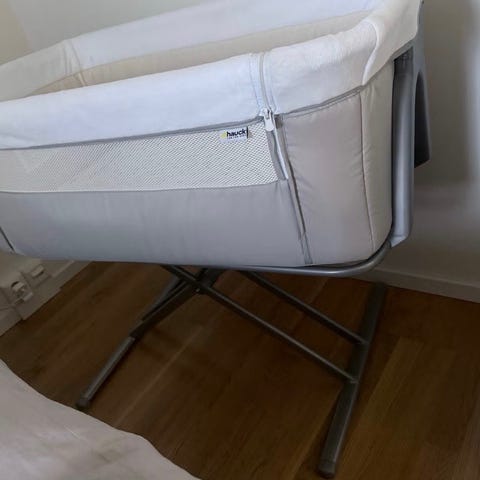 JLY bedside crib i grått tyg med vit insida och nätpaneler på sidorna. Står på ett justerbart stativ med hjul och lås samt medföljande remmar enligt bild.