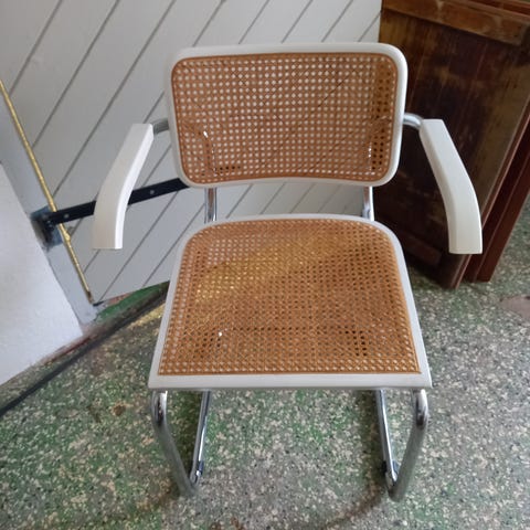Stol i Bauhaus stil, modell cesca. Endast avhämtning, betalning via Swish, armstöd är slipade med fint sandpapper pga. Att lacken hade börjat släppa där. Stålet har skavanker , se bilder. Kan tänka mig att sälj för mindre, kom med bud!
