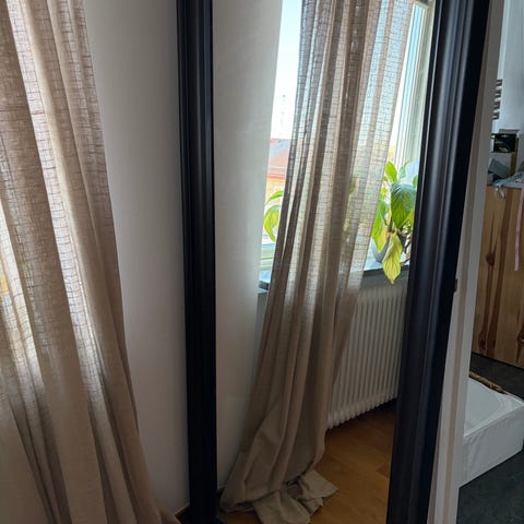 Stor spegel från IKEA med mörk ram som passar bra som helkroppsspegel. Hängd på väggen i sovrum nu, ger bra spegelbild och tar inte mycket plats.