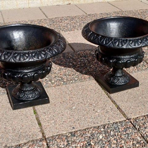 1st stor gjutjärnskruka med lejonhuvud. Köpt på auktion vid tidigt 1900-tal. Gammal och fin. Den har stått utomhus men är i fint skick och ingen rost.