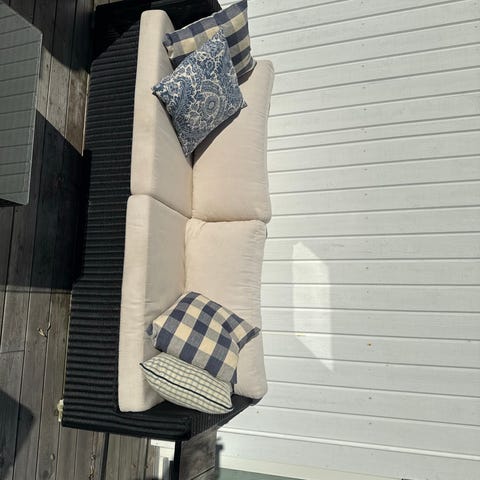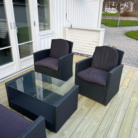 Hörngrupp med bord, stol och liten pall, mått ca 266 x 210 cm på soffdelen. Bordet har skiva i trälook och resten är i mörk konstrottingliknande material.