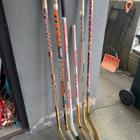 Flera hockeyklubbor i olika modeller och längder, bland annat en CCM-klubba. Bra för dig som vill ha några extra klubbor att spela med eller träna på skott med. Alla är för rightare utom den högra målvaktsklubban.