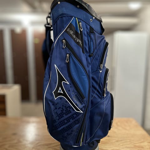 Klassisk Mizuno golfbag / staff bag / tour bag i blått och vitt med flera fack och vadderade klubbdelare upptill. Har axelrem och flera ytterfickor med dragkedja. Fantastisk Japansk kvalitet. Gott skick!