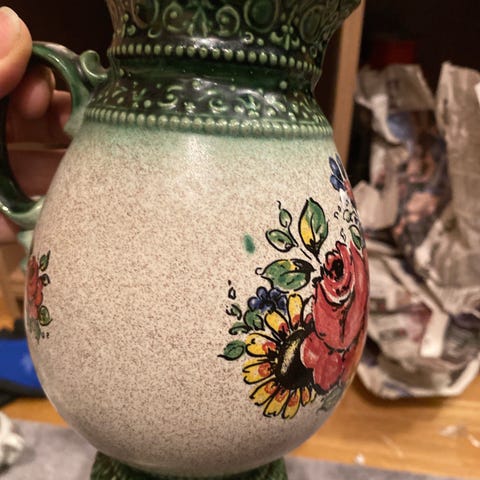En fin keramik kanna med handmålat blommönster i rosa, blått och grönt . Den har en gul kant upptill och nedtill. Höjd 20 cm och diameter 12 cm. Kannan har ett handtag och en rundad form, lämplig för servering av drycker eller blomvas.