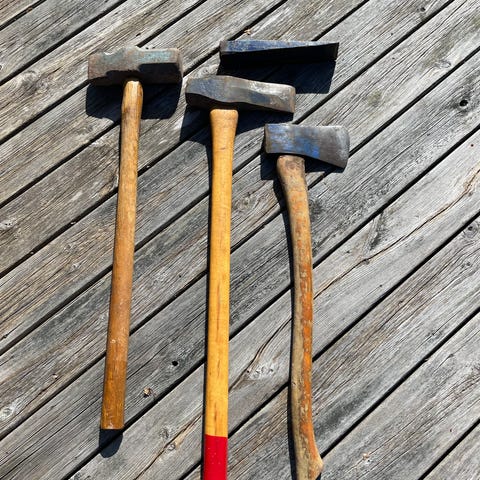 Rejäl yxa med träskaft och rött huvud, bra längd för arbete i trädgård eller skog. Har rak egg på ena sidan och klo på andra sidan för att dra eller bända.