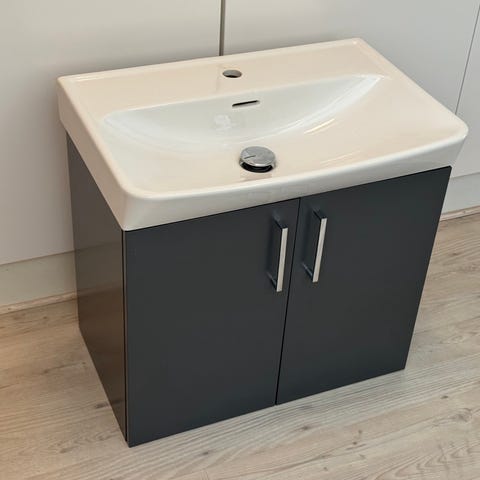 Vedum tvättställ med underskåp och två dörrar med metallhandtag. Skåpet har hylla inuti och tvättstället har hål för blandare och avlopp. Bredd 60, höjd 69, djup 39-43.