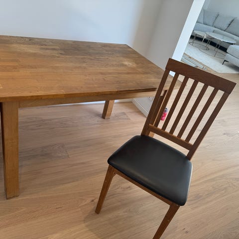 Säljer mitt köksbord i Ek färgad trä 140*89 , höjd 75 med två iläggs skivor som är 50 cm styck, bra skick 6 stycken stolar som är i typ konst skinn är slitna men det det finns överdrag som är fräscha. Inget ikea bord