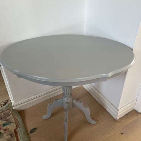 Omlackerat pelarbord. Stadigt, mindre märken på bordsben samt bordsskiva.