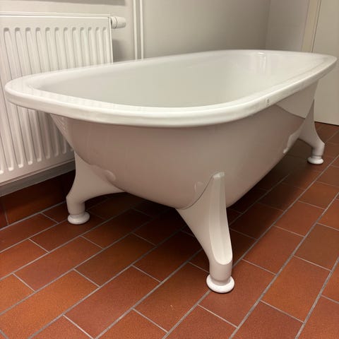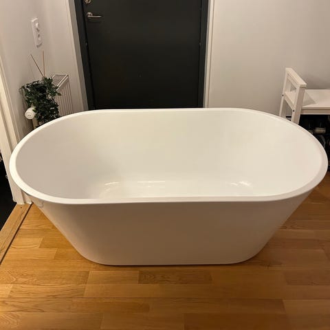 Vitt fristående badkar från Ifö med fyra ben. Avlopp i ena änden och rundade kanter som gör det skönt att luta sig tillbaka.