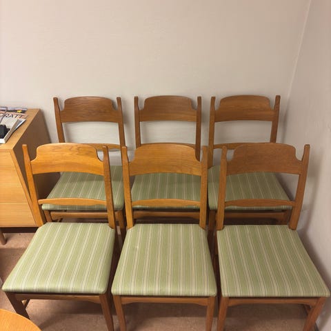 Stolar designade av Roberto Pamio för Mio med blå stoppad sits och rygg, stapelbara och med träram. Tillhörande rektangulära bord med träskiva och metallben, bra som set till exempelvis matplats eller samlingsrum.