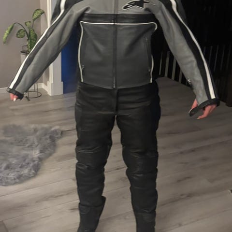Slitstarkt MC-ställ i läder med skydd i axlar, armbågar och knän. Bekväm passform med rörlighet och ventilation. Normalt slitage förekommer men inget som påverkar funktion eller säkerhet.