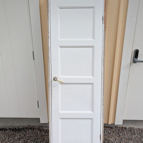Dörr med karm som suttit till badrum. Ena spegeln är utbytt mot frostat glas.