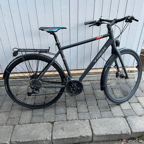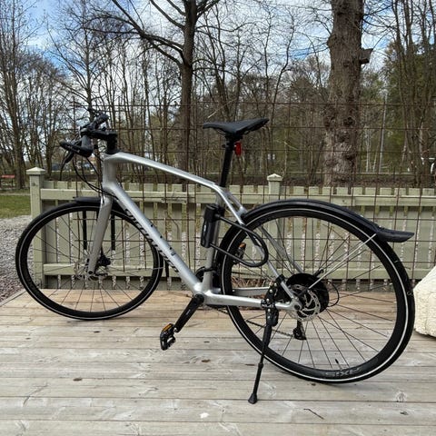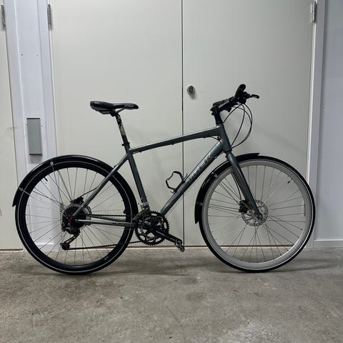 White SC Lite hybridcykel i stl L med 29"-hjul, grå ram och unisex-geometri. Utrustad med skärmar, pakethållare, stöd och skivbromsar fram och bak.
