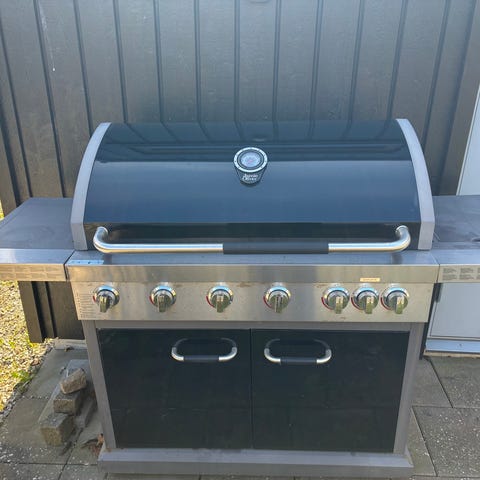 Kol och gasolgrill med två separata grilldelar och lock. Bredd 160 cm, djup 46 cm, grillyta 44x40 cm. Höjd 115 cm. Överdrag finns med men ingen gasol.