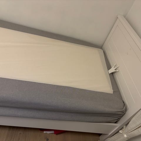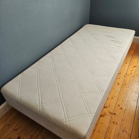 En 90 cm bred säng inkl ben, från Svane - i använt skick (dvs slitage finns, men den är fortfarande fullt användbar tycker jag). Bäddmadrass (otvättad) följer med "på köpet" om man vill.