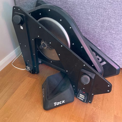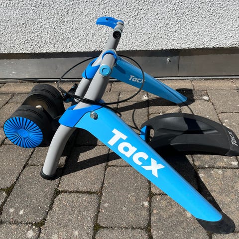 Tacx Flow cykeltrainer med elanslutning för inomhusträning. Stabil ram med rulle bak och medföljande blå träningsmatta/band runt hjulet (28x1,25).