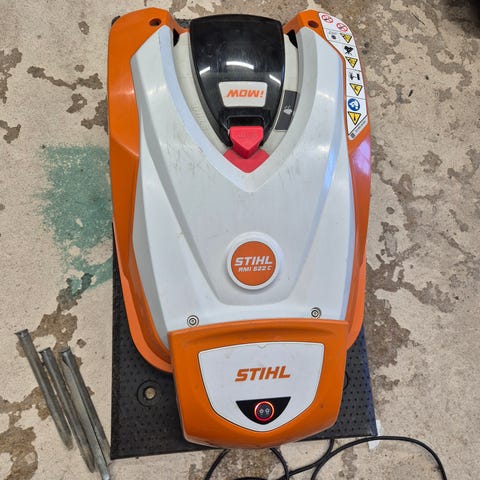 Stihl iMow RMI 422PC robotgräsklippare i orange och vitt med laddstation. Med följer kablar och manualer så den är redo att installeras i trädgården. Just nu hittar den inte laddstationen. Där av priset. Skickas EJ