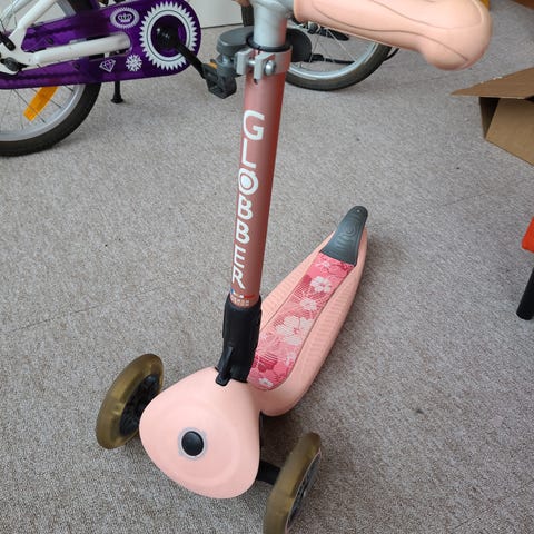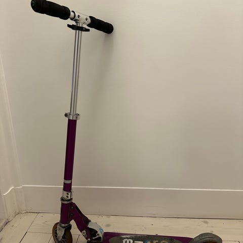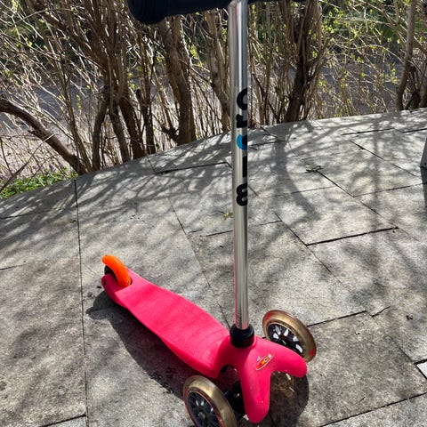 Rosa Micro Mini sparkcykel med tre hjul, lätt att styra för mindre barn. Har färgglada streamers på styret och en liten snurra framtill. Unik premiumsparkcykel som är svår att hitta i Sverige.