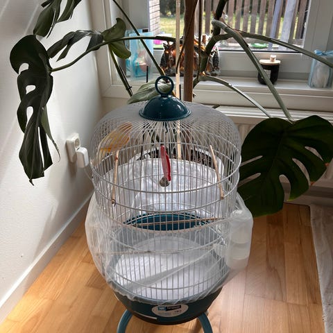 Honan med bur som är komplett kostar 1000kr. Lite foder ingår i priset.