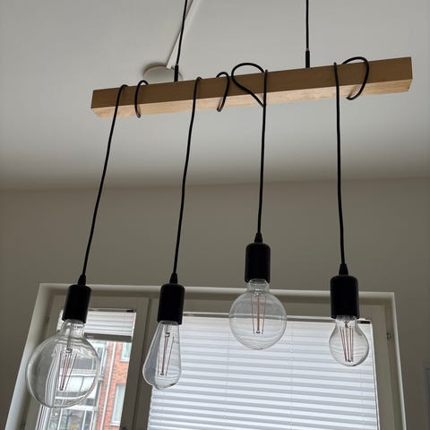 Fin taklampa med flera små ljuskällor som hänger ned som små armar. Ger ett mjukt, varmt sken och hänger i taket med rund takplatta.