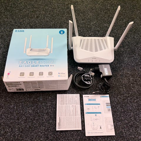 D-Link Eagle Pro AI R15 AX1500 router i vit färg med flera antenner.
