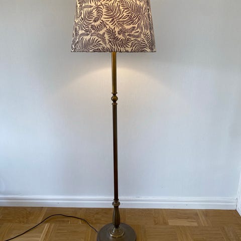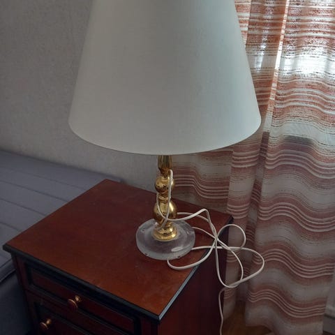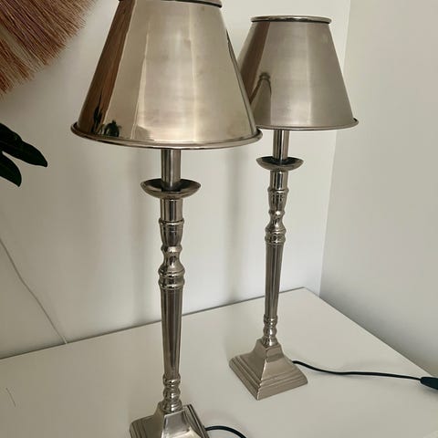 Två bordslampor i mässingsliknande metall med vit veckad skärm i gott skick.
