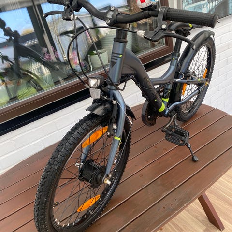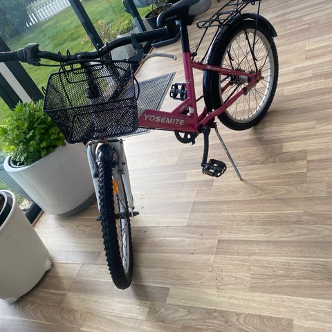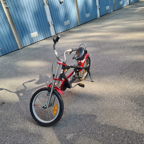 Röd Monark barncykel med 20" hjul och lågt insteg. Har pakethållare bak, skärmar och fotbroms.