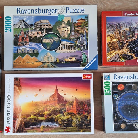 Säljer pussel med 1000 bitar, bland annat motiv med hus, katter, resor och ett Disney‑motiv. Fina färgglada bilder med mycket detaljer och olika teman på varje pussel.