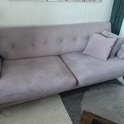 U-sits soffa med två schäslonger, en mindre och en längre . Går att dela på för enklare frakt. Inga super tydliga skador. Nackstöd ingår för skönare ställning.