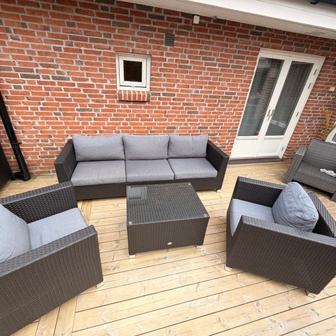 Fin loungesoffa som består av fyra moduler och en fotpall. Kan kombineras på olika sätt (se exempel på bilderna). Det ingår även ett bord med glasskiva. Gråa dynor med tvättbara överdrag. Allt förvarat inomhus vintertid.