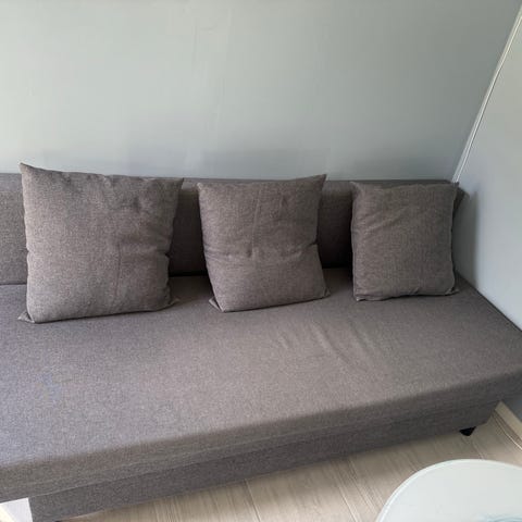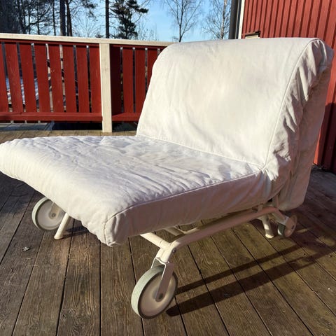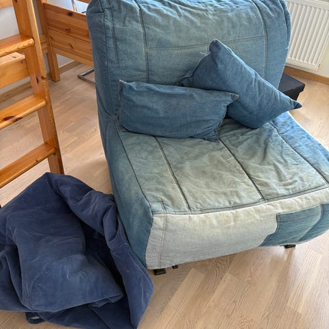 Säljer en Ikea PS bäddfåtölj med mörkblått, tvättbart, jeanstyg som överdrag. Lite använd och gott skick