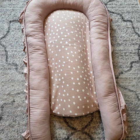 Babynest från Buddy & Hope i grön färg med vita prickar och volangkant runtom. Matchande skötbädd/underlag i samma mönster följer samma stil.