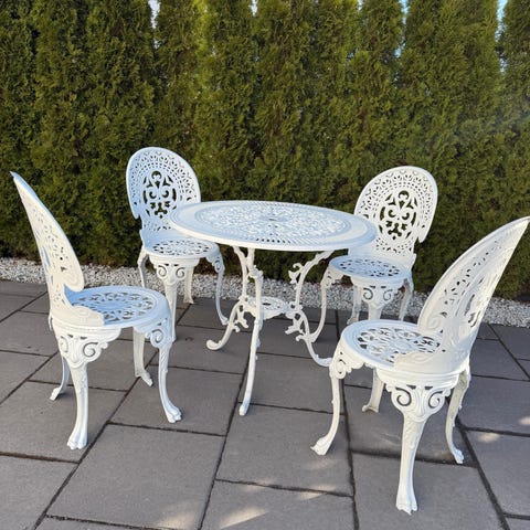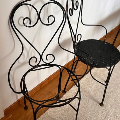 Fin svart smidesgrupp med en soffa och två stolar i stavjärn metall. Dekorativa svängda ryggstöd, passar bra både inne och ute på t.ex. balkong eller uteplats.