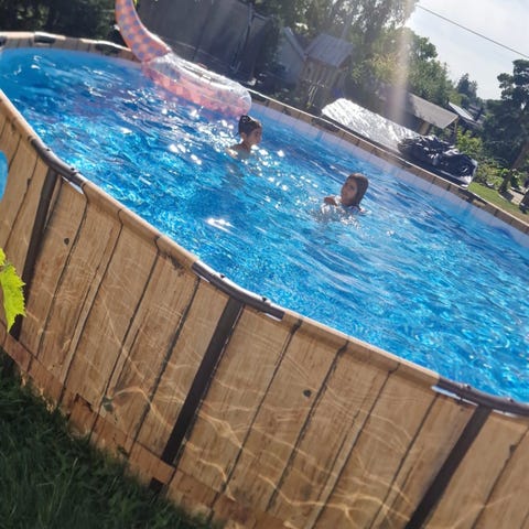 Poolen har stått stabilt och använts försiktigt. Inga kända läckor. Poolen har tvättas och torkats innan den har plockats ner efter förra sommaren.